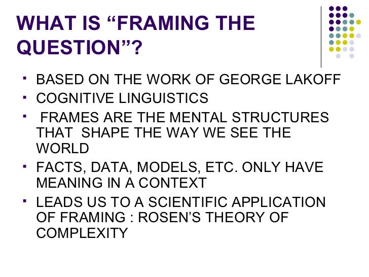 That's all about George lakoff framing, The relief frame is an instance of a more general rescue scenario in which there is a hero the reliever a victim the afflicted a. And he has used his research to inform how democrats can better frame. Emeritus professor of cognitive science and linguistics university of california at berkeley. Do not use their language. 06 19 2009 05 12 am et updated may 25 2011. Their language picks out a frame and it won t be the frame you want.